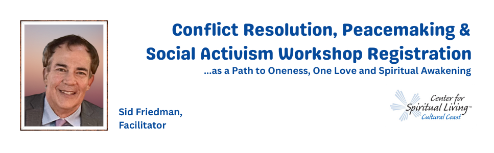 "Conflict Resolution, Peacemaking and Social Activism" workshop is on Sunday, October 12, 2025, 12:30 to 2:30 p.m. ET. It will be facilitated by Sid Friedman, Nonviolent Communication Workshop Lead and Internal Family Systems Facilitator and supported by Amara Palmer, Nonduality and Spiritual Awakening Teacher.